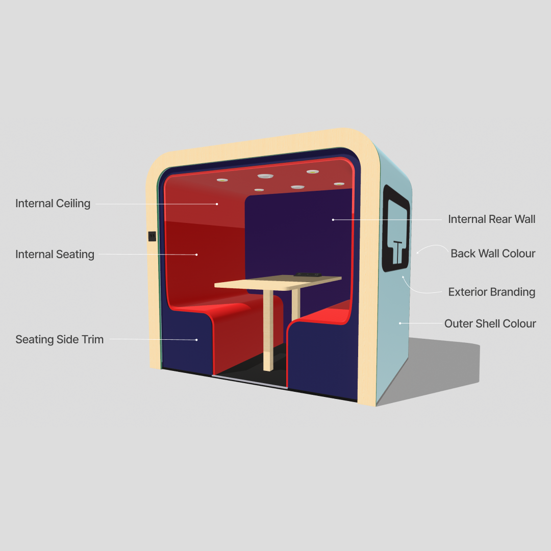 Inside, the pod features ergonomic seating, integrated LED lighting, and ceiling-mounted ventilation to maintain a fresh, comfortable interior. Choose from a wide range of fabrics, finishes, and optional branded elements to align with your company’s identity.