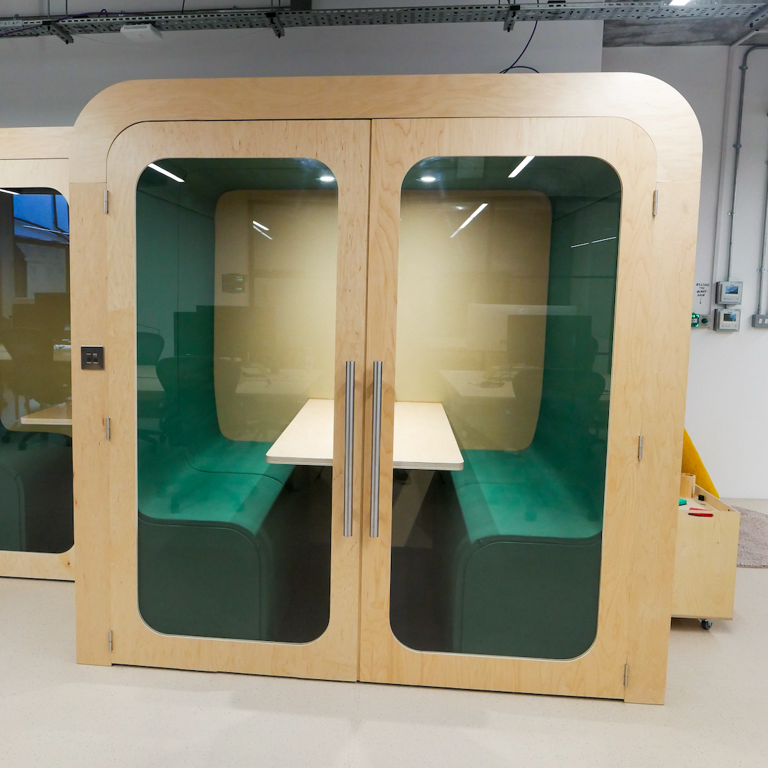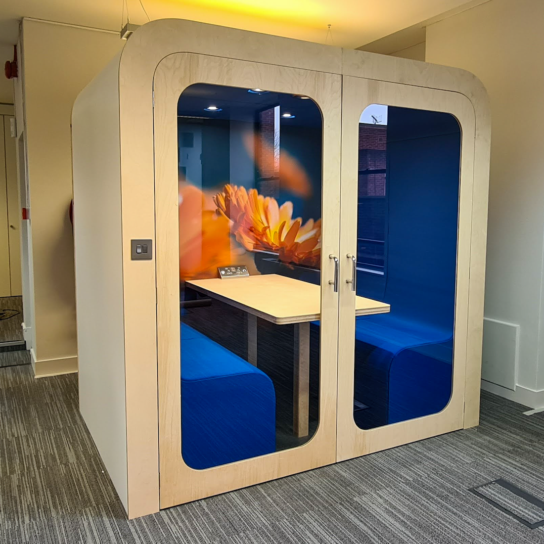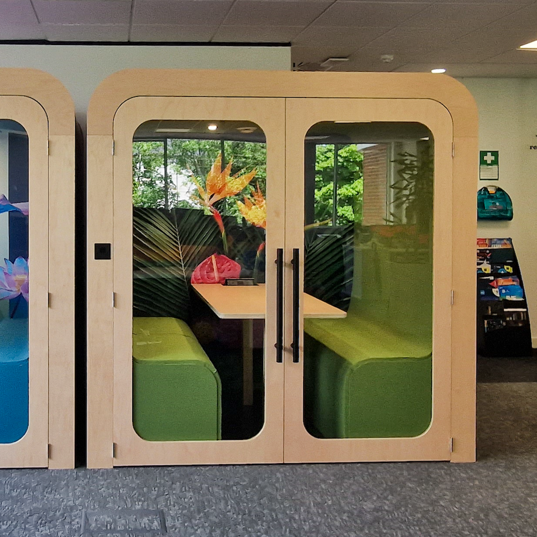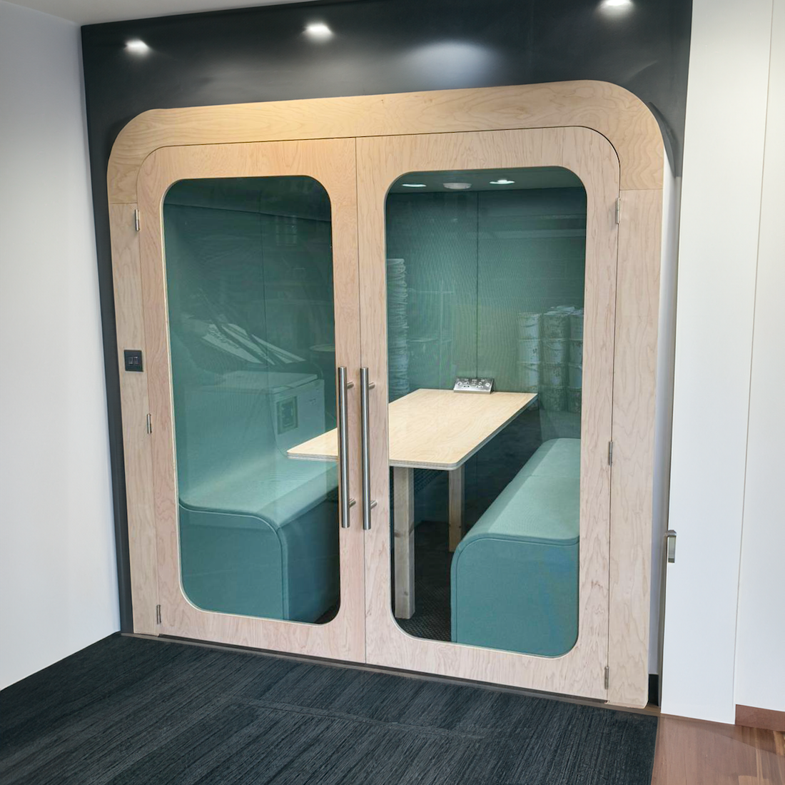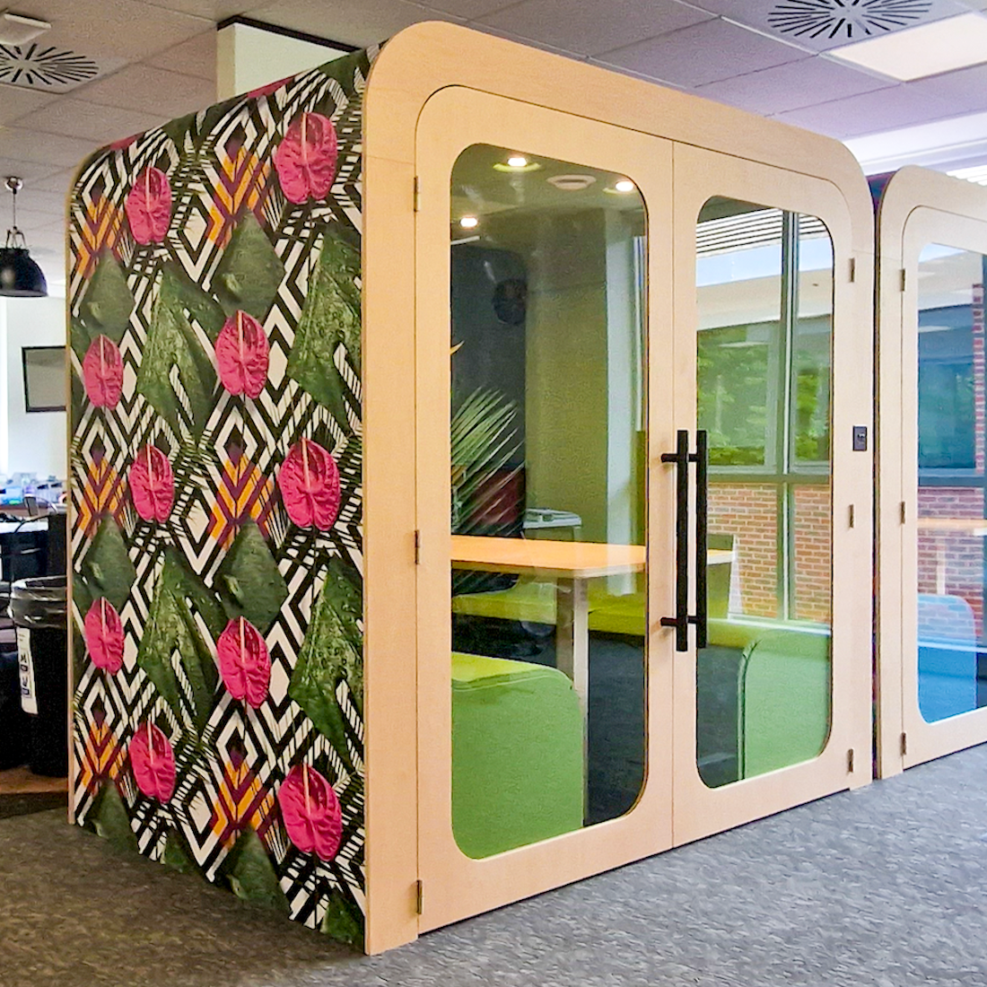Crafted with precision, the doors feature timber frames and 6.8mm acoustic glass inserts, complemented by polished chrome hinges and a discreet D profile handle with magnetic closure. Customize the rear walls with your choice of fabric or a flat colour, or enhance the pod's acoustics with a glass wall. Optional additions include dry wipe panels and TV/Monitors, making this pod a versatile and stylish addition to any modern office. Fast UK delivery and full customisation options available.