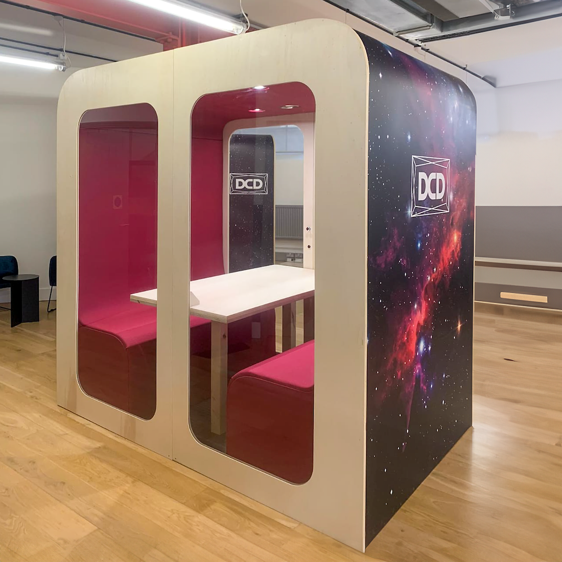 The four-person soundproof meeting room by Dapapod is our ultimate solution for collaborative and multifunctional office spaces. With room for four people, this spacious pod is perfect for meetings, Zoom calls, brainstorming sessions, or simply a quiet place to work without distractions. Its modular, geometric design, coupled with comfortable seating and a large laminated table, makes it a versatile addition to any office. Enhanced by soft ambient lighting and well-ventilated air circulation, the Quad Dapapod combines functionality and style. Crafted with sustainable materials and upholstered in eco-friendly Oceanic Fabrics by Camira, this pod not only meets high environmental standards but also offers exceptional durability and comfort.