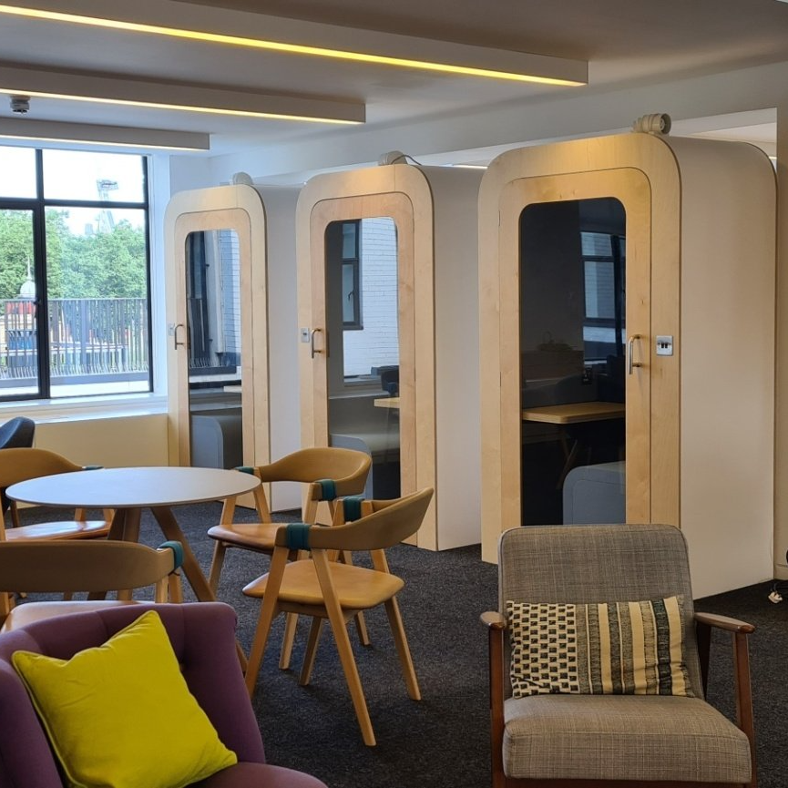 With a space-saving footprint of 210cm (H) x 125cm (W) x 70cm (D), this single-person booth fits seamlessly into any office or co-working space. Enhance your pod with bespoke options including brand colours, internal graphics, frosted doors, and tech upgrades like integrated USB and power sockets.